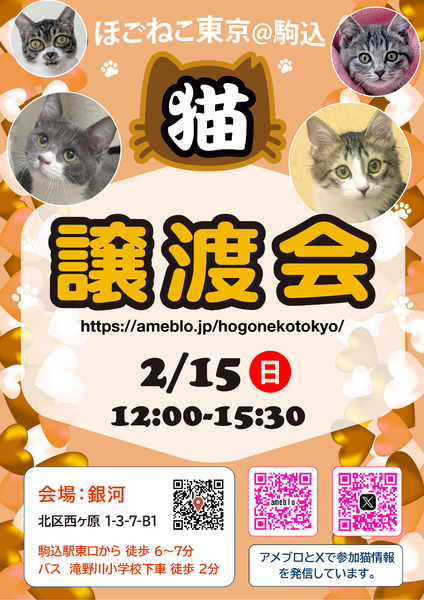 | イベント内容 | アットホームなお見合い会です。 毎月、尾久や駒込近隣で開催しています。 お見合い時間の制限はなく、ゆっくりじっくりご覧いただけます。どの猫にするか迷われた時は、休憩用の椅子に座ってお考えください。 ちびっこと若い猫たちが10〜20匹位参加します。 募集サイトに掲載していない猫も参加する事がありますので、ご来場いただき実際の猫をご覧いただきたく思います。 性格も色柄も様々。過酷な外暮らしをしてきた保護猫にご理解のある本気のご家族様をお待ちしています。 ======= ●ほごねこ東京@駒込 会場:銀河 北区西ヶ原1-3-7 B1 駒込駅東口から 徒歩6〜7分 バス 滝野川小学校下車 徒歩 2分 ●ほごねこ東京@尾久 会場:西尾久七本町会会館 荒川区西尾久7丁目-19-1 都電荒川線 荒川遊園地前駅 徒歩2分 JR東北本線 尾久駅 徒歩7分 ======= ●予約不要、入場無料です。 ●尾久会場は靴を脱いでいただきます。 ●手指消毒のご協力をお願いいたします。 ●アンケート用紙にご記入ください。 ●お申し込みしたい猫が見つかりましたら、スタッフにお声がけください。生活環境や条件についてヒアリングさせていただきます。 ●お申し込みは、希望の条件を満たしているかヒアリングにより保護主が判断させていただきます。その為、お話の順番をお待ちいただく事があります。 ●お申し込みの際に、1匹1000円の運営協力金をお願いしております。トライアル(パネル参加の子はお見合い)が成立しない場合も返金はいたしません。 ●トライアル(パネル参加の子はお見合い)決定の有無は後日お電話かSMSにてお知らせいたします。再度ヒアリングさせていただく事がありますのでご了承ください。当日決定はしません。 ●参加予定の猫が欠席、または変更する場合があります。 ======= <基本譲渡条件> ・ペット可物件に居住 ・ご家族全員の同意と面談 ・完全室内飼育(ベランダ、庭、帰省先や旅行先への同伴不可) ・空調などによる室温管理 ・責任と愛情をもって終生飼育 ・適切な医療措置(先住猫についても同様) ・質の良いフードの継続 ・不妊手術の実施と報告 ・脱走や危険防止対策 ・清潔な環境とお部屋の整理整頓 ・全てのお部屋の出入りが自由(特別な場合を除く) ・一部の医療費と支援金のご負担 ・身分証明書を提示と契約書の取り交わし ・写真数枚や動画付きの定期報告 ======= ※お申し込みをお断りさせていただく可能性があるケース ・一般的にご自身で終生飼育が難しい事が予想される方 (20年以上生きる長生きの子が増えています。最後までしっかりお世話する事ができるか、よくお考えください。子猫・幼猫希望は55歳位までを目安としておりますが、徒歩圏内に後見人がいるなど、条件次第で変わります。) ・子猫・幼猫希望でお留守番時間が長い方(お子様や高齢者のみのお留守番は不可です。) ・脱走防止など、安全対策に全面協力していただけない ・自動製品に頼りすぎなど、毎日の健康管理を怠っている ・安定収入(経済力)がない方 ・未成年、単身の方、妊娠中の方、高齢の方 ・個々が経済的に自立していない同棲カップル ・お部屋が狭い、猫が走り回れるスペースを確保できない(譲渡目安:1LDK〜、約40平米〜。猫により狭いお部屋でも可能な場合があります。) ・先住犬、ハイシニアの先住猫がいる ・喫煙者多数、動物に配慮しない喫煙者がいる ・ご家族お揃いで面談ができない(特別な場合を除く) ・お引っ越し予定がある ・動物に配慮しない喫煙者がいる ・ご家族お揃いで面談ができない(特別な場合を除く) ・お引っ越し予定がある など 保護主や、猫によって希望条件が異なります。 |