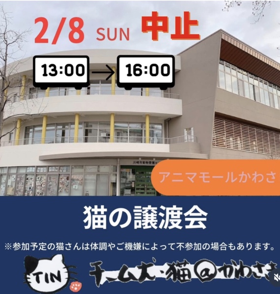 | イベント内容 | 川崎市動物愛護センター(アニマモール)1階会施設をお借りして猫の譲渡会を開催しています。 日時: 毎週日曜日 13時ー16時 お申込受付は15時30分までにお願い致します。 お車の方はセンター無料駐車場がご利用できます。 公共交通機関をご利用の方は、南武線の平間駅徒歩10分。 2月−3月最高気温13℃以上の土曜日、 場所;「溝の口譲渡会」溝の口駅北口ペデストリアンデッキ丸井側 開催時間:13時ー16時 を開催する場合があります。 どうぞ宜しくお願い致します。 ★譲渡会さん金子さんは➡️『チーム犬・猫@かわさき』ホームページ/インスタグラムURL★ https://teaminuneko-kawasaki.org/ https://www.instagram.com/team.inuneko.kawasaki/?utm_source=ig_embed&ig_rid=bbc4c879-2a7f-4051-bf97-945b15c5299f |