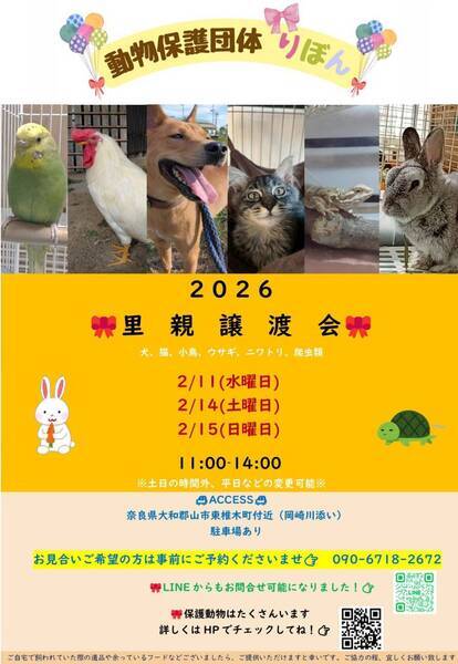 | イベント内容 | 自己紹介・活動内容など りぼんは、奈良県に拠点を置く動物保護団体です。 犬・猫・うさぎなどの小動物・インコやニワトリなどの鳥・両生類・爬虫類など動物種を問わず、お届け先も地域を問わず、動物たちと里親さまをつなぐ活動を行っています。 ◎ホームページ https://ribbon-foster.jimdofree.com/ ◎YouTube https://www.youtube.com/@ribbon-shelter https://www.instagram.com/ribbon_shelter1/(里親募集中の動物たち) https://www.instagram.com/ribbon_shelter/(ボランティア日記) Web Site https://ribbon-foster.jimdofree.com/ ribbon_shelter |