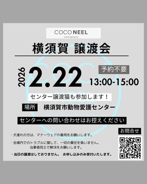 | イベント内容 | ・ ・ 譲渡会 @横須賀市動物愛護センター 2026.2.22(日)13:00〜15:00 【 ?参加犬決定しました? 】 ⚠️愛護センターへのお問い合わせはお控えください⚠️ お問い合わせはCOCO NEELホームページよりお願いいたします?♀️ ✼••┈┈┈┈••✼••┈┈┈┈••✼ ・会場・ 横須賀市動物愛護センター ?ナビで愛護センターの住所検索すると別の場所に案内される可能性があります。 浦郷町5 「夏島グラウンド」 で検索してください。 ?️駐車場 Times 夏島緑地 徒歩2分 ?バス 追浜駅より4系統(京急)追浜車庫行き追浜車庫 下車250m 会場でのお見合いをご希望の方は、譲渡条件をよくご確認の上、事前エントリーお願いします。詳細はHP、ブログからご確認ください。 ✳︎お願い✳︎ ・当日の譲渡(連れて帰ること)はできません ・犬連れの場合はマナーウェアの着用をお願いします ・会場内でのトラブルは当方一切責任を負いません。ご当人同士でお願いいたします ★当日は横須賀愛護センターの譲渡犬猫も見学ができます。 お立ち寄りください? @RYO ブログには愛護センターのURL貼り付けを お立ち寄りくださいの下に付けておいてください!! ⬇⬇⬇ https://www.yokosuka-doubutu.com/adopted-animals-cat/ #coconeel #coconeel保護犬 #ココニール #ここにいる #保護犬 里親募集 里親募集中 譲渡会 横須賀市動物愛護センター coconeel譲渡会 |