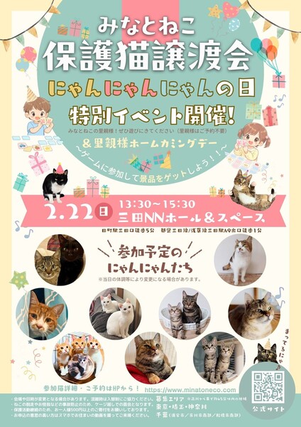 | イベント内容 | みなとねこが毎月定期開催している譲渡会です 今回はJR田町駅 徒歩5分、都営三田線 三田駅直結(A9出口)、都営浅草線 三田駅 徒歩3分の三田NNホール&スペースで開催いたします。 ご来場予約の上お越しいただきますとスムーズにご案内できます。 ご予約はみなとねこのHPよりお願いします https://www.minatoneco.com/event 会場や参加猫の詳細はこちら https://www.minatoneco.com/ ※参加猫たちの様子はみなとねこの各種SNSもご覧ください https://linktr.ee/minatoneco ーー Youtube「みなとねこ譲渡会に行ってみよう」 https://youtu.be/8Q4Gti1swQk 30ケージ 60匹ほどの参加となりますが、それ以外の預かり宅の猫もご紹介可能です 子猫は2匹ペアでの譲渡が原則です 初めての方こそ最初から2匹をお勧めしています また私たちボランティアは、ご縁のあった猫たちに終生里親様に愛されて幸せに安全に暮らして欲しいと願っています このため里親になっていただくにはいくつかの条件やお約束事があります。 ◆基本条件 (猫それぞれ、保護主により異なります) ・ ご家族全員が飼育に賛成であること ・ペット可物件での完全室内飼い、エアコンなどによる室温管理、医師の指示に従い定期的な受診やワクチン接種、 適切な時期(生後4ヶ月中)での避妊去勢、病気予防に配慮したフードの選択、終生飼養をお願いしております。 ・ケージのみの飼育、リビング以外の一室のみでの飼育は不可です。十分な運動のスペースと窓から景色が眺められのんびり日向ぼっこが可能な環境が望ましいと考えています。 ・誤食などの事故防止のため、お部屋の整理整頓や脱走防止にも万全の対策をお願いします。 ・換気が十分でない室内での喫煙をされる方はお断りしております。 ・日々のお世話だけでなく、スキンシップが可能な精神的・時間的・経済的な余裕がある方に限らせていただきます。猫が20年以上生きる中でなるべく変わらぬ環境で愛情を注いで頂けるよう、家族構成やお仕事、お住まいに変化のない方を優先させていただきます。 またお届けやフォローの都合上、募集エリアも東京、神奈川、埼玉に限らせていただいております。 ■里親申込書類一式はみなとねこHPよりダウンロードをお願いします https://www.minatoneco.com/foster-entry 会場では里親申込書を拝見して簡単なヒアリングを行います 会場にてご記入いただくことも可能ですが、希望の方が多いとお待ちいただくことになりますので、お手元で印刷していただきご記入の上ご来場いただくことをおすすめしております ※ご家族にアレルギーがある方、喫煙者がいる場合には是非事前にご相談ください ※猫と暮らしたことのない未就学児がいらっしゃる場合には事前にアレルギー検査などお勧めします 実際の参加予定猫 譲渡会前日の21:00までにみなとねこのHPやFacebookページでご紹介します https://m.facebook.com/minatoneco/ 直接ご応募の方は詳細をLINEなどでやりとりの上で預かり宅でのお見合いも行っております。 そうした中で譲渡会前に里親様が決定することもございますことご了承ください ※予約優先、30分入替制、混雑時は入場をお待ちいただくなどのご協力をお願いしております ※換気のためにドアをオープンしての開催のためにケージ越しでのご対面となりますことご理解ください ※譲渡会の開催や保護活動の継続のため、お一人様500円以上のご寄付をお願いしております |