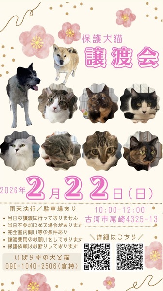 | イベント内容 | 保護犬猫を家族に迎えてみませんか? ずっとのおうちを待っています 小さな譲渡会なのでとってもアットホーム☻ 迎えたい方も会ってみたい方もどなたでも大歓迎です♪ 保護っ子 元気いっぱいお待ちしております!! 予約不要/雨天決行/駐車スペース有 (開催場所が分かりにくいので下記の連絡先までご連絡頂ければご案内致します) ※譲渡条件などありますので当会の里親募集ページやHPをご確認ください※ 【不要になったフード(未開封).タオル.ペットシートなどありましたら、ご寄付いただけると助かります】 ⚫︎お問合せ⚫︎ 電話▷090-1040-2506 (クラモチ) LINE ID▷ 717217 (モトハシ) |
