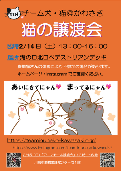 | イベント内容 | ★「溝の口駅北口」ペデストリアンデッキ丸井側。(南武線・田園都市線) 屋外になるため最高気温13℃以上予報の日に臨時開催しております。 猫さんたちケージ内は防寒(ヒーター、風除けなど)し温かくして参加致します。 頑張りますので是非お立ち寄りください。 どうぞ宜しくお願い申し上げます。 ★譲渡会参加猫さんは➡️『チーム犬・猫@かわさき』ホームページ/インスタグラムURL★ https://teaminuneko-kawasaki.org/ https://www.instagram.com/team.inuneko.kawasaki/?utm_source=ig_embed&ig_rid=bbc4c879-2a7f-4051-bf97-945b15c5299f |