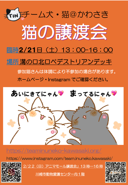 | イベント内容 | ★「溝の口駅北口」ペデストリアンデッキ丸井側。(南武線・田園都市線) 屋外になるため最高気温13℃以上予報の日に臨時開催しております。 猫さんたちケージ内は防寒(ヒーター、風除けなど)し温かくして参加致します。 頑張りますので是非お立ち寄りください。 どうぞ宜しくお願い申し上げます。 ★譲渡会参加猫さんは➡️『チーム犬・猫@かわさき』ホームページ/インスタグラムURL★ https://teaminuneko-kawasaki.org/ https://www.instagram.com/team.inuneko.kawasaki/?utm_source=ig_embed&ig_rid=bbc4c879-2a7f-4051-bf97-945b15c5299f |