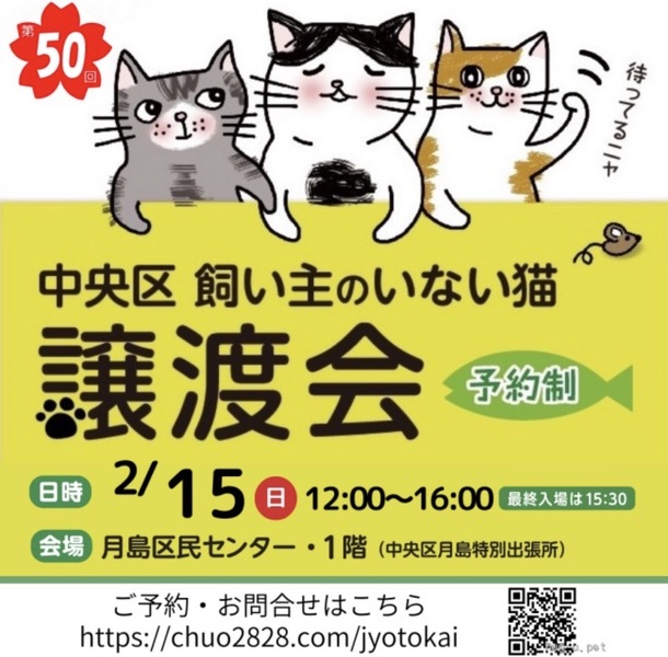 | イベント内容 | 中央区では様々な事情で飼い主のいないネコ達にずっとのおうちを見つけるために中央区動物との共生推進員が中心となって、譲渡会を定期開催しており今回で50回目を数えます。 区内の高齢者からの引き取りネコなど大人猫はもちろん、 子猫たちも参加します。 ※お届けやフォローの関係で中央区在住の方や隣接区在住の方を優先させていただきます。 ※猫の多くは春に生まれますので今の時期は生後半年過ぎた手術の終わった体調も安定した子猫や大人猫が中心です。 お留守番が長い方や初めて猫を飼う方でも飼いやすい子も参加します。 ネコとの暮らしをご希望されている方、ネコのお預り希望の方、またネコとの暮らしについて色々ご質問がおありになる方、皆様のご来場をお待ちしております。 ※里親を希望される方は、本人確認できる物をご持参の上、当日会場まで直接お越し下さい。 会場内の混雑を防ぐため、事前に来場希望時間と来場予定人数をご連絡ください。 <譲渡会> 開催日:2026年2月15日(日曜日) 開催時間:12:00〜16:00(最終入場時間15:30) 会場:中央区月島区民センター 1階会議室 譲渡会の事前お申し込みはこちらから → https://www.chuo2828.com/jyotokai 里親さま募集中の猫ちゃんはこちら → https://www.chuo2828.com/catslist 参加猫の情報は、譲渡会の1週間前くらいにWebに掲載する予定です。 今回も1匹でも多くの猫さんたちに、新しい家族とのご縁が繋がりますように。 |