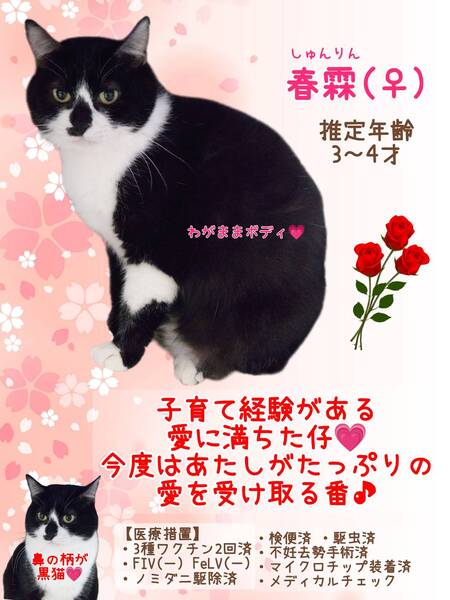 | イベント内容 | 【秘密結社ねこのひげ♡保護猫譲渡会】 2/15(日) 13:00~16:00 埼玉県鶴ヶ島市三ツ木新町1-1-13 カインズ鶴ヶ島店1F カルチャー教室 にて保護猫譲渡会を開催します♪ 昨年秋生まれの仔猫たちや 脳内はまだまだ仔猫やでー! なオトナ猫も元気いっぱい参加します♪ ずっとのご家族さまと 愛し愛されな 両想いになれますように♡ 家族にするなら保護猫だべ♪♪ 新しい家族と笑顔で暮らしたい♪ という方は是非会いにいらしてください♡ ご不明な点がございましたら Instagram @nnnkanto DMにてお問い合わせ下さい☆ |