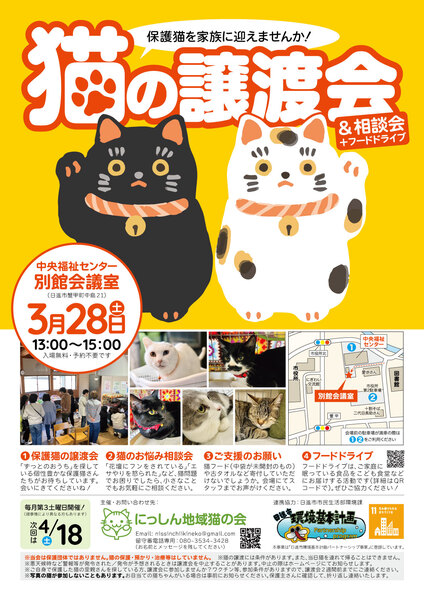 | イベント内容 | 3月28日(土)に「猫の譲渡会&相談会」を開催いたします。 保護猫を迎えたい方はもちろん、猫に関する相談会も同時開催しています。 ご近所との猫トラブルなどでお悩みの方も、どうぞお気軽にお立ち寄りください。 地域貢献の一環として、子ども食堂などに食材を提供するフードドライブの受付もしております。 ご家庭や職場で余っている食品がありましたらぜひお持ちください! 小さな譲渡会ですが、猫さんも人間も良いご縁を紡げられるよう、のんびり続けています。 遊びにきてくださいね(*^^*) 【日時】3月28日(土)13:00〜15:00 【会場】中央福祉センター「別館会議室」 【入場無料・予約不要】 【主催】にっしん地域猫の会 【ホームページ】https://nissinchiikineko.main.jp ※会場は中央福祉センター本館内ではなく、その隣の奥まったところにある小さな建物「別館会議室」にて開催しております。お手数ですが、HPにて地図をご確認ください(中央福祉センターへのお問い合わせはご遠慮ください)。 ※会場前に駐車場がございますが、数が少ないため、満車時は本館の駐車場をご利用ください。図書館のむかいにある市役所の臨時駐車場もご利用いただけます。 ※室内換気のため冷暖房が効きにくい場合がございます。 ※ペット同伴のご入場はできません。 ※猫ちゃんの譲渡には条件がございます。詳細はホームページをご参照ください。 |