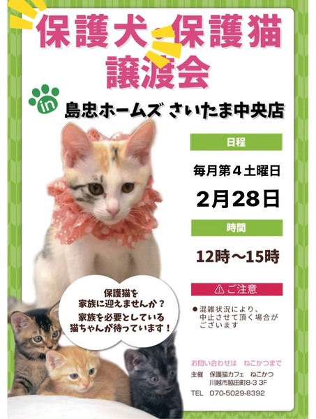 | イベント内容 | *保護犬・保護猫譲渡会* 日時:2/28(土)12時~15時 場所:ホームズさいたま中央店さま いつもお世話になっている 島忠ホームズさまでの譲渡会✨ さいたま中央店様にて《保護犬》の譲渡会も開催します?!! 猫だけでなく、家族を探している保護犬も沢山います。 わんちゃんのお迎えを検討されている方は ぜひ足を運んでみてください✨ お待ちしております!! *…..*…..*…..*…..*…..*…..*…..*…..*…..*….*…..*…..*…..* しっぽたちの物語 Instagram https://www.instagram.com/sippotatinomonogatari?igsh=MXVkbzh3d3lnNzloOA== *…..*…..*…..*…..*…..*…..*…..*…..*…..*….*…..*…..*…..* |