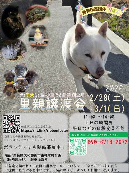 | イベント内容 | 自己紹介・活動内容など りぼんは、奈良県に拠点を置く動物保護団体です。 犬・猫・うさぎなどの小動物・インコやニワトリなどの鳥・両生類・爬虫類など動物種を問わず、お届け先も地域を問わず、動物たちと里親さまをつなぐ活動を行っています。 ◎ホームページ https://ribbon-foster.jimdofree.com/ ◎YouTube https://www.youtube.com/@ribbon-shelter https://www.instagram.com/ribbon_shelter1/(里親募集中の動物たち) https://www.instagram.com/ribbon_shelter/(ボランティア日記) Web Site https://ribbon-foster.jimdofree.com/ ribbon_shelter |