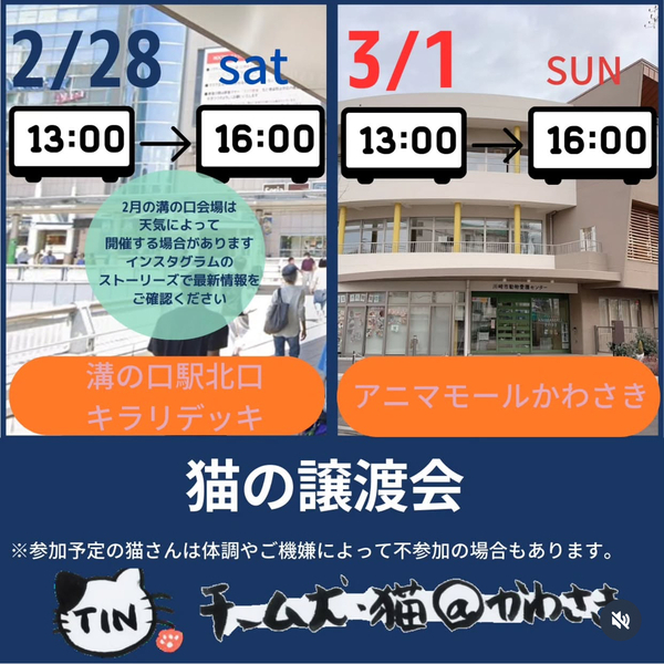 | イベント内容 | ★川崎市動物愛護センター(アニマモールかわかき)1階 南武線平間駅下車徒歩10分位 お車でお越しの方はセンター敷地内無料駐車場がご利用できます。 ★譲渡会参加猫さんは➡️『チーム犬・猫@かわさき』ホームページ/インスタグラムURL★ https://teaminuneko-kawasaki.org/ https://www.instagram.com/team.inuneko.kawasaki/?utm_source=ig_embed&ig_rid=bbc4c879-2a7f-4051-bf97-945b15c5299f |