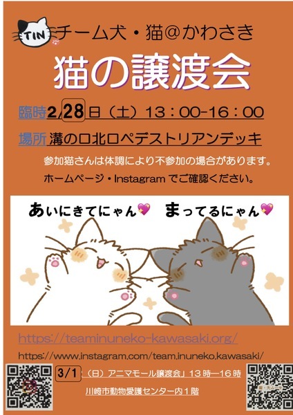 | イベント内容 | ★「溝の口駅北口」ペデストリアンデッキ丸井側(南武線・田園都市線) 屋外になるため最高気温13℃以上予報の日に臨時開催しております。 猫さんたちケージ内は防寒(ヒーター、風除けなど)し温かくして参加致します。 頑張りますので是非お立ち寄りください。 どうぞ宜しくお願い申し上げます。 ★譲渡会参加猫さんは➡️『チーム犬・猫@かわさき』ホームページ/インスタグラムURL★ https://teaminuneko-kawasaki.org/ https://www.instagram.com/team.inuneko.kawasaki/?utm_source=ig_embed&ig_rid=bbc4c879-2a7f-4051-bf97-945b15c5299f ●3月1日(日)アニマモール譲渡会 13時−16時 開催!無料駐車場あり 快適な室内でゆっくり保護猫さんに会えますので是非お立ち寄りください! |