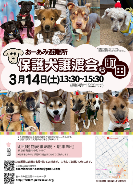 | イベント内容 | ☆★☆★☆★☆★☆★☆★☆★☆★☆★☆★☆★☆★☆ ~3月14日(土)町田にて譲渡会開催!~ ◎場所・・「明和動物愛護病院」 東京都町田市中町1-8-7 小田急線「町田」駅より徒歩約8分 ◎日程・・3月14日(土)(雨天決行) ◎時間・・ 13:30~15:30 (受付15:00まで) (*駐車場なのですが満車の場合はこちらでご案内します。) *参加の際は、アルコール消毒のご協力をお願いいたします。 *混雑状況により、入場制限をさせていただく場合がございます。 ※参加予定の犬は体調により参加できない場合があります。ご了承ください。 ☆★☆★☆★☆★☆★☆★☆★☆★☆★☆★☆★☆★☆ |