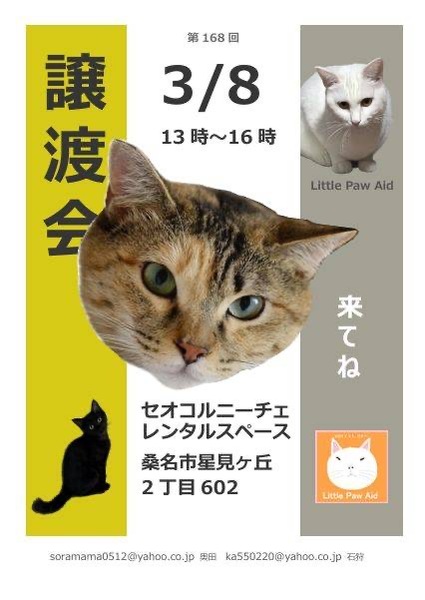 | イベント内容 | 日時 3月8日(日)13時~16時 場所 セオコルニーチェレンタルスペース 三重県桑名市星見ヶ丘2丁目602 小さい子はいません。 参加猫は少ないですがみんな保護主さんに大切にされている子たちです。 みんなとても可愛いです 猫を始めて迎える方にも飼いやすい子達だと思います 保護主さん達が頑張ってケアした子達です。 ぜひ会いに来て下さい 慣れてない子もゴロゴロの甘えん坊もみんな個性的で可愛いです 猫を飼いたいと思っている方も猫を見てみたいと思っている方もお気軽に遊びに来て下さい それぞれの保護主により譲渡条件があります 当日猫を連れ帰る事はできません。 参加猫は保護主のブログで確認ください。 ◆参加者 リトルパウエイド https://blog.goo.ne.jp/ka550220/e/da0fa7f743a938b9030d35e95e0a0263 http://blog.livedoor.jp/cats_voice_pawaid/ ほんわか猫な日々 https://ameblo.jp/sango-12/ はるごまいけのブログ http://ameblo.jp/harugoma3futagozaru/ 予約は不要です 連絡先 soramama0512@ezweb.ne.jp 奥田 |