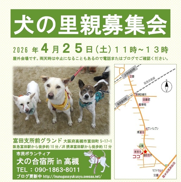 | イベント内容 | ※広い屋外広場での里親募集会です。 オトナのわんちゃんばかりの地味な集まりですが、一頭一頭に十分関わって頂いて、一緒にお散歩したりしながらそれぞれの個性をより深く理解して頂けると思います。 ※屋外会場ですので、雨天時は中止にする可能性がありますので電話でご確認ください。 犬によっては別会場をご案内できる場合があります。 (電話でのお問合せ→090-1863-8011) ※先住ワンちゃんを連れて会いに来て頂けます。相性を見るためにも、是非是非、連れてきてください。 ※近付きましたら コチラのサイトや、「犬の合宿所in高槻」のブログでも参加予定犬等の詳しい情報を紹介していきます。 保健所からの新しい引き取りワンコが増える可能性がありますので、それも含めて譲渡会情報のチェックをお願いいたします。 ➡ https://inunogassyukusyo.seesaa.net/article/520391455.html 予約は不要ですが、参加犬が直前に変更する場合がありますので、会いたいワンちゃんが決まっている場合は事前にご確認頂く方が確実かと思います。 【お問合せ】 090-1863-8011 ・・・・・・・・・・ 【アクセス】 ・阪急京都線 富田駅から徒歩約10分 ・JR京都線 摂津富田駅から徒歩約12分 ※隣接する富田支所と公民館の駐車場は使えませんが、会場広場内に駐車できる場合があります。 事前にご確認ください。(090-1863-8011) ・・・・・・・・・・ 市民ボランティア「犬の合宿所in高槻」は、現地での譲渡が難しい離島の保健所収容犬を引き取り関西で新しい飼い主探しをしています。 保護犬を家族として迎えることが文化として定着し、生体販売に伴う悲惨な繁殖犬の存在がなくなることを願っています。 ・・・・・・・・・・・・・・・・・・・・・・・・・・・・・ ★ 一時預かりさんや犬の搬送ボランティアさん、里親募集会の当日お手伝いの方など常時募集しています。 ★犬によっては個別お見合いできる場合があります。 里親募集会に参加できない方で個別お見合いをご希望の方は、預かりさんとの日程調整が必要ですので、電話でお問合せください。⇒090-1863-8011 |