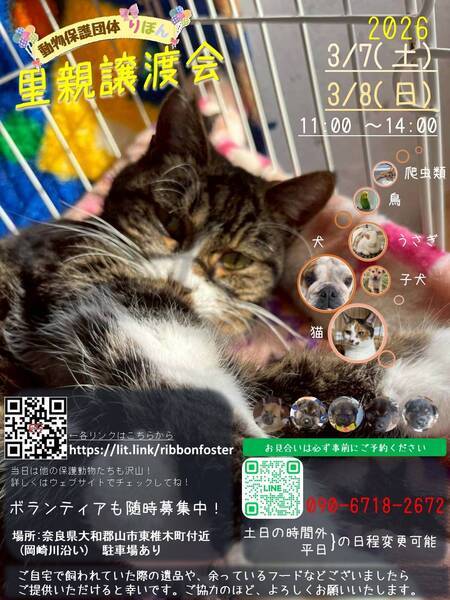 | イベント内容 | りぼんは、奈良県に拠点を置く動物保護団体です。 犬・猫・うさぎなどの小動物・インコやニワトリなどの鳥・両生類・爬虫類など動物種を問わず、お届け先も地域を問わず、動物たちと里親さまをつなぐ活動を行っています。 ◎ホームページ https://ribbon-foster.jimdofree.com/ ◎YouTube https://www.youtube.com/@ribbon-shelter https://www.instagram.com/ribbon_shelter1/(里親募集中の動物たち) https://www.instagram.com/ribbon_shelter/(ボランティア日記) Web Site https://ribbon-foster.jimdofree.com/ ribbon_shelter |