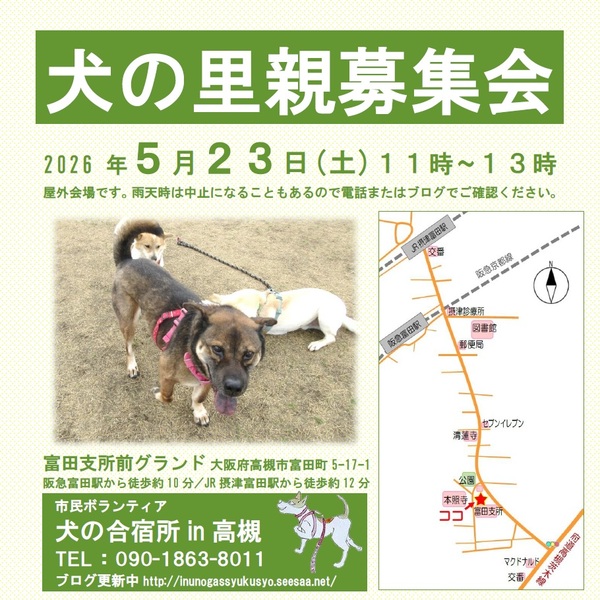 | イベント内容 | ※広い屋外広場での里親募集会です。 オトナのわんちゃんばかりの地味な集まりですが、一頭一頭に十分関わって頂いて、一緒にお散歩したりしながらそれぞれの個性をより深く理解して頂けると思います。 ※屋外会場ですので、雨天時は中止にする可能性がありますので電話でご確認ください。 犬によっては別会場をご案内できる場合があります。 (電話でのお問合せ→090-1863-8011) ※先住ワンちゃんを連れて会いに来て頂けます。相性を見るためにも、是非是非、連れてきてください。 ※近付きましたら コチラのサイトや、「犬の合宿所in高槻」のブログでも参加予定犬等の詳しい情報を紹介していきます。 ブログ➡ http://inunogassyukusyo.seesaa.net/ 保健所からの新しい引き取りワンコが増える可能性がありますので、それも含めて譲渡会情報のチェックをお願いいたします。 予約は不要ですが、参加犬が直前に変更する場合がありますので、会いたいワンちゃんが決まっている場合は事前にご確認頂く方が確実かと思います。 【お問合せ】 090-1863-8011 ・・・・・・・・・・ 【アクセス】 ・阪急京都線 富田駅から徒歩約10分 ・JR京都線 摂津富田駅から徒歩約12分 ※隣接する富田支所と公民館の駐車場は使えませんが、会場広場内に駐車できる場合があります。 事前にご確認ください。(090-1863-8011) ・・・・・・・・・・ 市民ボランティア「犬の合宿所in高槻」は、現地での譲渡が難しい離島の保健所収容犬を引き取り関西で新しい飼い主探しをしています。 保護犬を家族として迎えることが文化として定着し、生体販売に伴う悲惨な繁殖犬の存在がなくなることを願っています。 ・・・・・・・・・・・・・・・・・・・・・・・・・・・・・ ★ 一時預かりさんや犬の搬送ボランティアさん、里親募集会の当日お手伝いの方など常時募集しています。 ★犬によっては個別お見合いできる場合があります。 里親募集会に参加できない方で個別お見合いをご希望の方は、預かりさんとの日程調整が必要ですので、電話でお問合せください。⇒090-1863-8011 |
