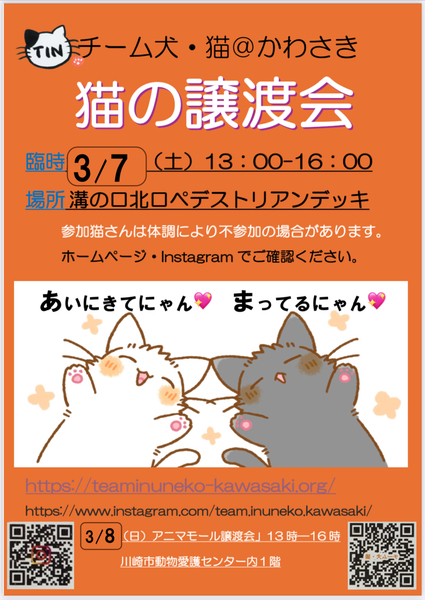 | イベント内容 | ★「溝の口駅北口」ペデストリアンデッキ丸井側(南武線・田園都市線) 屋外になるため最高気温13℃以上予報の日に臨時開催しております。 猫さんたちケージ内は防寒(ヒーター、風除けなど)し温かくして参加致します。 頑張りますので是非お立ち寄りください。 どうぞ宜しくお願い申し上げます。 ★譲渡会参加猫さんは➡️『チーム犬・猫@かわさき』ホームページ/インスタグラムURL★ https://teaminuneko-kawasaki.org/ https://www.instagram.com/team.inuneko.kawasaki/?utm_source=ig_embed&ig_rid=bbc4c879-2a7f-4051-bf97-945b15c5299f ●3月8日(日)アニマモール譲渡会 13時−16時 開催!無料駐車場あり 快適な室内でゆっくり保護猫さんに会えますので是非お立ち寄りください! |