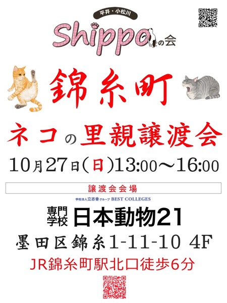 | イベント内容 | 10月27日(日)錦糸町の専門学校日本動物21様のご協力により、同校舎で猫の里親譲渡会を初めて開催させていただくことになりました。 13時00分スタートです! ヤンチャな子猫からお留守番バッチリの大人猫さんたちが参加予定です。 一緒に保護した兄弟猫さん、一生懸命子育てしたママ猫さん、ハンディでも元気猫さん等々、個性豊かな猫さんたちが準備万端で、里親さんとのご縁を待っています。 参加猫さんはこちらからご覧下さい。(随時更新) ↓ https://www.pet-home.jp/member/user360938/post/ https://www.pet-home.jp/member/user574503/post/ https://www.pet-home.jp/member/user247571/post/ 子猫ちゃんたちも参加予定なので、小さい頃から一緒に暮らしたい、育てたいとお考えの方、ぜひお越しください! 一人暮らしの方やご高齢の方にもぴったりの、まったりした大人猫さんたちも参加予定です。 参加できない猫さんたちも、会場内で紹介予定です。 きっと、運命の出会いがあると思います。 里親希望の皆さま、ぜひ、足をお運びください! ●日時:10月27日(日) 13:00~16:00 ●会場:墨田区錦糸1-11-10 4F(専門学校 日本動物21 ) ●アクセス: JR総武線・総武快速線「錦糸町駅」 北口徒歩6分 東京メトロ半蔵門線「錦糸町駅」 3出口徒歩6分 ※東京都墨田区錦糸1-2-1(アルカタワーズ)は同校の法人本部です。 里親譲渡会の会場ではございませんので、お間違いのないよう御願い致します。 ●参加猫および諸条件については、下記「ペットのおうち」からご覧ください。(随時更新) https://www.pet-home.jp/member/user360938/post/ https://www.pet-home.jp/member/user574503/post/ https://www.pet-home.jp/member/user247571/post/ ☆譲渡には当会における一定の条件があります。 ☆当会および里親譲渡会についてのお問い合わせ ☆外猫、保護猫のために物資のご支援を頂ける方がおりましたら、送付先をご連絡させていただきますのでご連絡下さい。 ☆預かりボランティアさん、活動のお手伝いをして頂ける方も随時募集中です。 hilakoma@yahoo.co.jp ☆当会のブログ https://ameblo.jp/hirakomashippo/ |