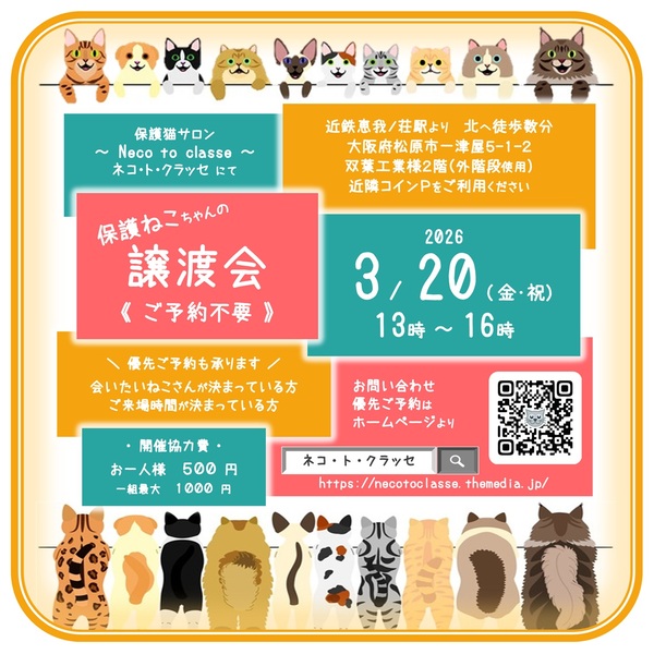 | イベント内容 | \\ ご予約不要 // 会いたい猫さんが決まっている方やご来場時間が決まっている方は優先的にご案内をさせていただきますので、ホームページよりご予約ください。 参加猫さんもホームページからご確認ください。 https://necotoclasse.themedia.jp/ (Google等で「ネコトクラッセ」で検索できます) ※ 各猫さんの募集ページのタイトルに「◆3/20◆」と書かれた猫さんが参加します。 ※ 参加猫さんは一週間前頃から順次お知らせしていきます。 ※ 譲渡会までにトライアルが決定したり、体調不良などで急遽不参加となる場合もございます。 ◆ 開催場所 ◆ 保護猫サロン ネコ・ト・クラッセ 大阪府松原市一津屋5-1-2 双葉工業様2階(外階段使用) 近鉄南大阪線恵我ノ荘駅から北へ徒歩数分 近隣コインパーキングをご利用ください (敷地内は他店様専用駐車場のため駐車ご遠慮ください) ◆ 当日のお願い事項 ◆ ○ 開催協力費としてお一人様 500円、1組最大 1000円 を頂戴しております。 ○ 猫さんの感染対策のため、入室時の手指消毒、靴下着用をお願いしております。 ○ 未成年、学生の方のみでのご来場はお断りしております。 ○ 先着順ではありません。また、当日連れて帰ることはできません。 ◆ 譲渡に際して ◆ ○ 後日ご自宅へのお届けとなります。その際、飼育環境、脱走防止策等の確認をさせて頂きます。 ○ 譲渡誓約書の取り交し、身分証明書のご提示(双方とも)をお願いしております。 ○ トライアル期間(2週間程度)を経ての正式譲渡となります。 ◆ 譲渡条件 ◆ ○ 参加猫さんにはそれぞれ保護主様がおられ譲渡条件が異なりますが、下記は共通の条件となります。 (猫さんごとの詳細条件については、それぞれの募集ページをご確認ください) ○ ペット飼育可住宅にお住まいの方。 (犬や小動物のみ可の場合や頭数制限にご注意ください) ○ ご家族全員の同意が得られている方。 ○ トライアル期間中は頻繁に、譲渡後も折を見て状況報告をして下さる方。 ○ 予防医療や早期治療に積極的に取り組んで下さる方。 ○ 完全室内飼い、ケージのご用意、脱走防止対策に最善を尽くして下さる方。 (ご想像以上に脱走したまま帰って来られなくなる猫さんが沢山います。玄関を開けた際の足下のすり抜けが非常に多いため、市販の柵やDIYで玄関ドアまで来られない対策をお願いしております。) ○ 仔猫さんの場合は、お留守番時間が短く少しの体調変化でもすぐに通院できる方。 (避妊去勢手術が未済の場合は、正式譲渡は手術完了後となります) |