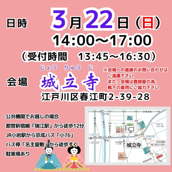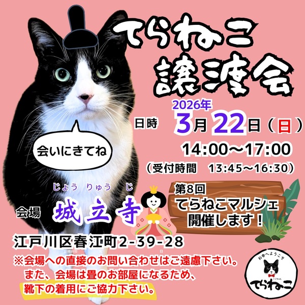 | イベント内容 | 子猫から成猫まで、たくさんの猫ちゃんが参加します。 8回目となる「てらねこマルシェ」も同時開催! 猫雑貨、アニマルコミュニケーションなど、猫好き以外も楽しめるイベントになる予定。 最新情報はInstagramで発信しています‼️ てらねこ譲渡会は、江戸川区支援ボランティアが運営を担い、区外の保護主にも門戸を開き、季節のお花に囲まれた美しいお寺、城立寺様のご協力の下、開催しています。 単身者、高齢者の方など、なかなかお迎えが叶わない方もご相談ください。 子猫から成猫までたくさんの可愛い猫ちゃんが参加します(体調不良の場合、予告なく不参加になる場合があります) 【第22回 てらねこ譲渡会】 日時:2026年3月22日(日) 14:00~17:00 (受付13:45/最終受付16:30) 会場:城立寺(じょうりゅうじ) 住所:江戸川区春江町2-39-28 https://maps.app.goo.gl/rE7j8HNxzK1VV3rAA?g_st=com.google.maps.preview.copy ・公共機関でお越しの場合 都営新宿線「瑞江駅」から徒歩12分 JR小岩駅から京成バス「小76」 バス停「名主屋敷」から徒歩すぐ ※敷地内に駐車スペースがあります(満車の際は近隣にコインパーキングもあります。 |