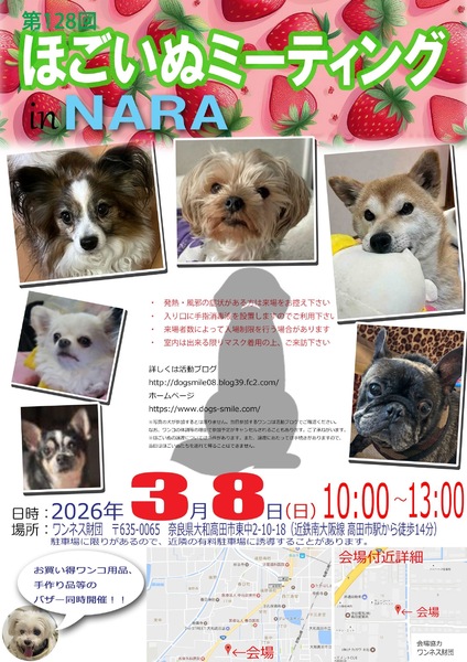 | イベント内容 | 3月8日(日曜日)10時~13時、奈良県大和高田市のワンネス財団エモーショナルリテラシーセンターをお借りして「第128回ほごいぬミーティングat奈良大和高田」を開催します。 保護犬を家族に迎えようと考えている方、保護犬に会ってみたい方、保護犬について知りたい方、ぜひご来場ください。 相性を見るためなど先住わんこさん、卒業わんこさんのご参加ももちろんOKです。 当日は、Dog's smileグッズやワンコ用品の販売、Dog's smileを応援してくださる方々が手作りされた手作り雑貨などの販売も行います。どれもお買い得です。 また、売り上げは、私たちの活動資金になります。ぜひご協力をお願いします。 来場者のみなさまには、感染症の予防に御協力をお願いします。 ・発熱・風邪の症状のある方の入場は御遠慮願います。 ・入場時は、手指消毒への御協力をお願いします。 ・来場者の状況により、入場制限を行う場合があります。 なお、来場予定のワンコについては、活動ブログでご確認ください。 日時 令和8年3月8日(日)午前10時~午後1時 場所 ワンネス財団エモーショナルリテラシーセンター 奈良県大和高田市東中2-10-18 (近鉄南大阪駅高田市駅から南に徒歩14分) 協力 ワンネス財団、株式会社松田電気工業 |