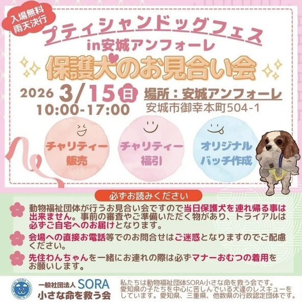 | イベント内容 | 『プティシャンドッグフェス』に一般社団法人SORA小さな命を救う会も、お見合い会とチャリティーイベントで参加させていただきます。 フリマでの収益は、全て保護犬の医療など保護活動使わせていただきます。 是非、ご家族みなさんで遊びに来てくださいね。 *雨天決行 ★12キロまでのワンちゃんのみ入場可です 先住ワンちゃんを一緒にお連れの際は必ずマナーオムツ着用をお願いします。マナーオムツの着用がない場合は、その場でマナーオムツをご購入頂くか、もしくは、ご入場をお断りすることがあります。 事前のお申込みは不要です。保護活動ブログで、開催日の数日前に譲渡会参加が決定したワンコたちのご案内もしておりますので、ご希望のワンコの参加をご確認してお越し頂けますと幸いです。 SORA公式ホームページ https://sora-chiisana.org/foster/ SORA公式活動メインブログ https://ameblo.in/snra-rhiisana-innrhi/ SORAイベントブログ https://ameblo.jp/sora-charity-events/ |