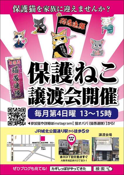 | イベント内容 | 会場は「城北公園通り駅」から徒歩5分! 物販もたくさんあります。 ご来場お待ちしています! ❥・・ ┈┈┈┈┈┈┈┈┈┈┈┈ ・・❥ 【 会場 】 大阪市旭区赤川3丁目3−1 【 アクセス 】 城北公園通り駅から徒歩5分 赤川交差点、商店街入り口になります。 【駐車場】 スシローの駐車場がコインパーキングになっています。 近くにコインパーキングがたくさんありますので車でお越しのさいはそちらへお停めください。 【 参加条件 】 参加費は無料です。 予約は不要です。 猫さんを迎えたい!という熱い気持ち。 【 お問合せ 】 インスタのDMにてお問い合わせください。 ?キャットフードバンク? 食べ残しの物でも遠慮なくいただきます! ご自宅の猫さんが買ったのに食べへんやないかーい!なフードがありましたら、持ってきていただけると嬉しいです。 あと爪とぎとか…( ˙-˙ ) |