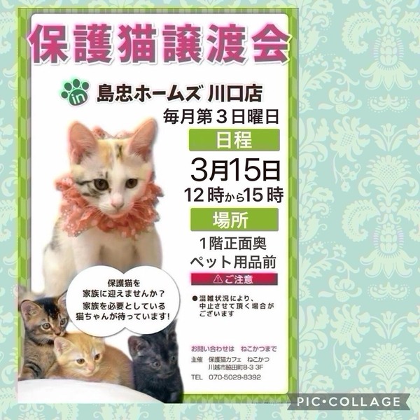 | イベント内容 | *保護猫譲渡会* 日時:3/15(日)12時~15時 場所:ホームズ川口店さま 島忠ホームズ川口店さまの譲渡会に参加予定です。 センターからの引き出し、飼育崩壊や所有権放棄などで、生きる場所を失った猫たちが、最大限の医療にかけてピカピカになりました。 写真の猫の他にも甘えっこちゃんたちが、溢れる笑顔でお待ちしています。 ぜひご参加ください。 ***譲渡条件*** *完全室内でお願いします *逸走防止対策にご協力頂ける方 *写真付きの身分証をご提示頂ける方 *LINE若しくはメールでのやりとりが可能な方 *譲渡に関する覚え書きにご署名頂ける方 *初期医療費をご負担頂ける方 *その他の譲渡条件を、譲渡会場でお話させて頂ける方 *猫が生まれた年から20年後に、80歳を超えていない方 *お一人暮らしの方は、後見人さまのご同席が必要です *…..*…..*…..*…..*…..*…..*…..*…..*…..*….*…..*…..*…..* しっぽたちの物語 Instagram https://www.instagram.com/sippotatinomonogatari?igsh=MXVkbzh3d3lnNzloOA== *…..*…..*…..*…..*…..*…..*…..*…..*…..*….*…..*…..*…..* |