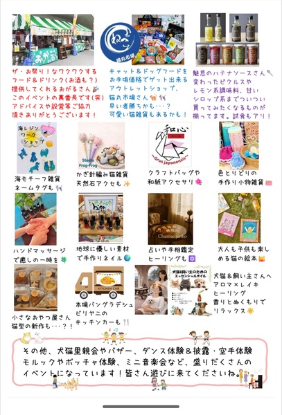 | イベント内容 | 年に一度のコラボイベント! 里親会は13時~16時ですが、マルシェイベントは11時からスタートします♪ 今回は、猫はもちろん小型犬~中型犬まで、様々な子達が参加してくれます。 マルシェも美味しいものから可愛い雑貨、ヒーリング系まで盛りだくさんの内容となっていますので、是非是非遊びに来てください♡ |