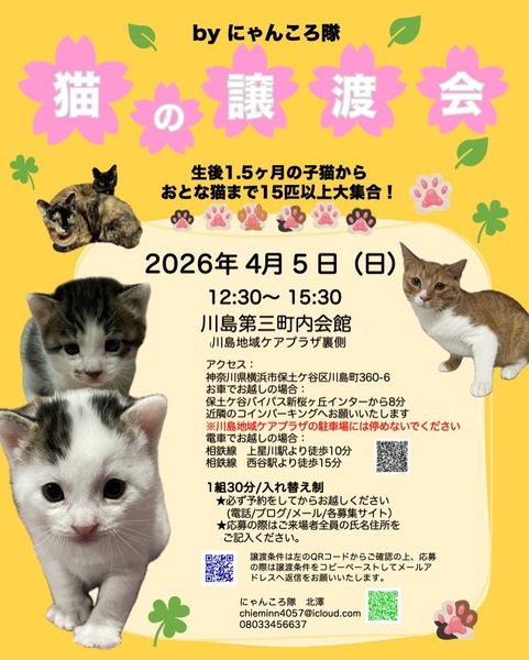 | イベント内容 | 猫ちゃんの譲渡会を開催いたします。 1.5ヶ月位からの猫さん15匹以上 大人猫さんも参加です。 月 日 2026年 4月 5日 日曜日 時 間 12時30分~15時30分まで 場所 神奈川県横浜市保土ケ谷区川島町360-6 川島第三町内会館(川島地域ケアプラザ裏側) 車 保土ケ谷バイパス新桜ヶ丘インターから8分 近隣のコインパーキングにお願いいたします。 (手前にある川島地域ケアプラザの駐車場には停めないでください) 電車 相鉄線 上星川駅より徒歩10分 相鉄線 西谷駅より徒歩15分 ★里親希望さまへお願い★ 必ず予約をしてからおいでください。 各回 30分 3~4組様 おいでになる方全員の氏名住所を記入をお願いいたします。 譲渡条件があります。お問い合わせください。 ご確認の上、ご応募ください。 猫の譲渡について http://nyankorotai.blog.fc2.com/blog-category-5.html 上記の譲渡条件をコピーペーストして下記アドレスへ送ってください。 追ってご連絡いたします。 お電話にても受付いたします。 下記の譲渡条件を送ってくださっても大丈夫です。 ◆ご応募時に下記事項をお知らせください◆ 1.お名前、簡単な住所 2.先住動物の有無(ワクチン 不妊手術の有無等)と選んだ理由 3.家族構成(家族全員の年齢 関係 お仕事等) 4.住宅環境(一戸建て 分譲マンション 一戸建て賃貸 賃貸マンションペット可) 5.留守番の時間 6.下記の①~⑨までの同意 ◆応募者様へのお願い◆ ①一生涯、家族の一員としてくださる事(猫は20年生きます) ②完全室内飼いでお願いします。 (脱走防止対策をお願いします。ケージ 脱走防止扉 玄関窓等) ③不妊手術及び毎年のワクチン接種など健康管理 (不妊手術済のご連絡は必須) ④家族全員の同意があること ⑤ペット可住宅にお住まいであること。 (ペット不可にお住まいの方には譲渡できません) ⑥身分証明の提示及び誓約書を記入していただきます。 ⑦譲渡後の近況報告をしていただける方 ⑧譲渡費用等をご負担できる方 (初期医療行為は済ませてお届けします) ⑨ほとんどの猫さんがお外から保護した子です。 その辺の事をご理解していただける方 猫が小さい場合はお留守番の短い家を希望します。 ケージのご用意をお願いいたします。 申し訳ありませんが先住動物さんが4匹以上のご家庭はお断りさせていただいております。 無職 学生 未成年の方からの申込は受け付けておりません。 ご家族に未就学児のいるお家及び高齢者の方は要相談 2匹一緒を優先させていただきます。 双方の条件が合った場合は譲渡会又は保護先にお見合にきていだだき成立後に自宅室内へお届けいたします。 この時期なので近くに方を優先させていただく事もあります。 ご予約お待ちしております。 にゃんころ隊 http://nyankorotai.blog.fc2.com 担当 北澤(にゃんころ隊) chieminn4057@icloud.com |