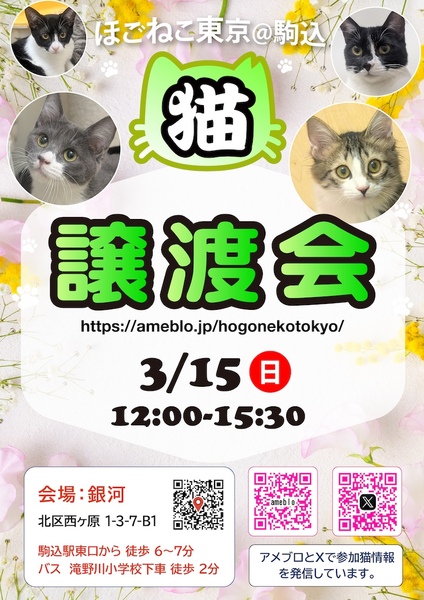 | イベント内容 | アットホームなお見合い会です。 毎月、尾久や駒込近隣で開催しています。 お見合い時間の制限はなく、ゆっくりじっくりご覧いただけます。どの猫にするか迷われた時は、休憩用の椅子に座ってお考えください。 ちびっこと若い猫たちが10〜20匹位参加します。 募集サイトに掲載していない猫も参加する事がありますので、ご来場いただき実際の猫をご覧いただきたく思います。 性格も色柄も様々。過酷な外暮らしをしてきた保護猫にご理解のある本気のご家族様をお待ちしています。 ======= ●ほごねこ東京@駒込 会場:銀河 北区西ヶ原1-3-7 B1 駒込駅東口から 徒歩6〜7分 バス 滝野川小学校下車 徒歩 2分 ●ほごねこ東京@尾久 会場:西尾久七本町会会館 荒川区西尾久7丁目-19-1 都電荒川線 荒川遊園地前駅 徒歩2分 JR東北本線 尾久駅 徒歩7分 ======= ●予約不要、入場無料です。 ●尾久会場は靴を脱いでいただきます。 ●手指消毒のご協力をお願いいたします。 ●アンケート用紙にご記入ください。 ●お申し込みしたい猫が見つかりましたら、スタッフにお声がけください。生活環境や条件についてヒアリングさせていただきます。 ●お申し込みは、希望の条件を満たしているかヒアリングにより保護主が判断させていただきます。その為、お話の順番をお待ちいただく事があります。 ●お申し込みの際に、1匹1000円の運営協力金をお願いしております。トライアル(パネル参加の子はお見合い)が成立しない場合も返金はいたしません。 ●トライアル(パネル参加の子はお見合い)決定の有無は後日お電話かSMSにてお知らせいたします。再度ヒアリングさせていただく事がありますのでご了承ください。当日決定はしません。 ●参加予定の猫が欠席、または変更する場合があります。 ======= <基本譲渡条件> ・ペット可物件に居住 ・ご家族全員の同意と面談 ・完全室内飼育(ベランダ、庭、帰省先や旅行先への同伴不可) ・空調などによる室温管理 ・責任と愛情をもって終生飼育 ・適切な医療措置(先住猫についても同様) ・質の良いフードの継続 ・不妊手術の実施と報告 ・脱走や危険防止対策 ・清潔な環境とお部屋の整理整頓 ・全てのお部屋の出入りが自由(特別な場合を除く) ・一部の医療費と支援金のご負担 ・身分証明書を提示と契約書の取り交わし ・写真数枚や動画付きの定期報告 ======= ※お申し込みをお断りさせていただく可能性があるケース ・一般的にご自身で終生飼育が難しい事が予想される方 (20年以上生きる長生きの子が増えています。最後までしっかりお世話する事ができるか、よくお考えください。子猫・幼猫希望は55歳位までを目安としておりますが、徒歩圏内に後見人がいるなど、条件次第で変わります。) ・子猫・幼猫希望でお留守番時間が長い方(お子様や高齢者のみのお留守番は不可です。) ・脱走防止など、安全対策に全面協力していただけない ・自動製品に頼りすぎなど、毎日の健康管理を怠っている ・安定収入(経済力)がない方 ・未成年、単身の方、妊娠中の方、高齢の方 ・個々が経済的に自立していない同棲カップル ・お部屋が狭い、猫が走り回れるスペースを確保できない(譲渡目安:1LDK〜、約40平米〜。猫により狭いお部屋でも可能な場合があります。) ・先住犬、ハイシニアの先住猫がいる ・喫煙者多数、動物に配慮しない喫煙者がいる ・ご家族お揃いで面談ができない(特別な場合を除く) ・お引っ越し予定がある ・動物に配慮しない喫煙者がいる ・ご家族お揃いで面談ができない(特別な場合を除く) ・お引っ越し予定がある など 保護主や、猫によって希望条件が異なります。 |