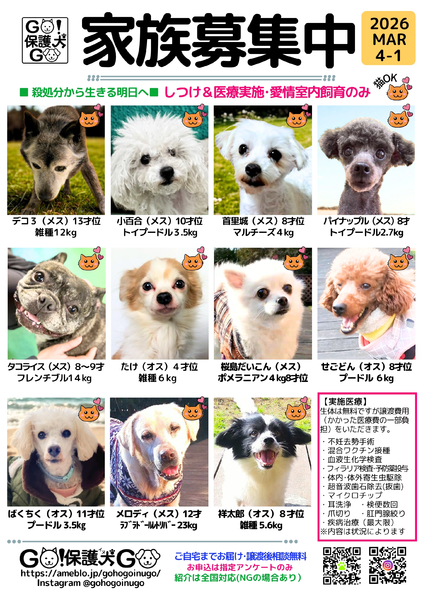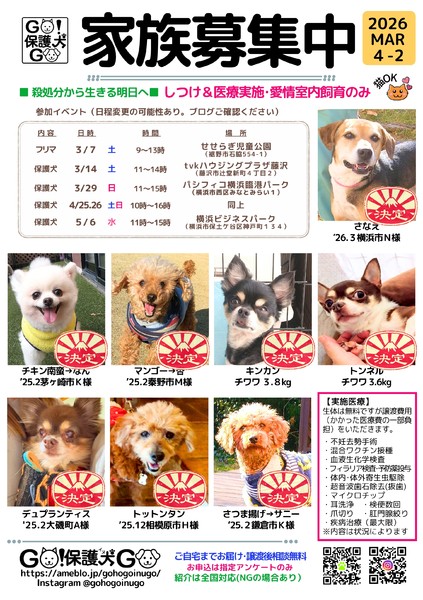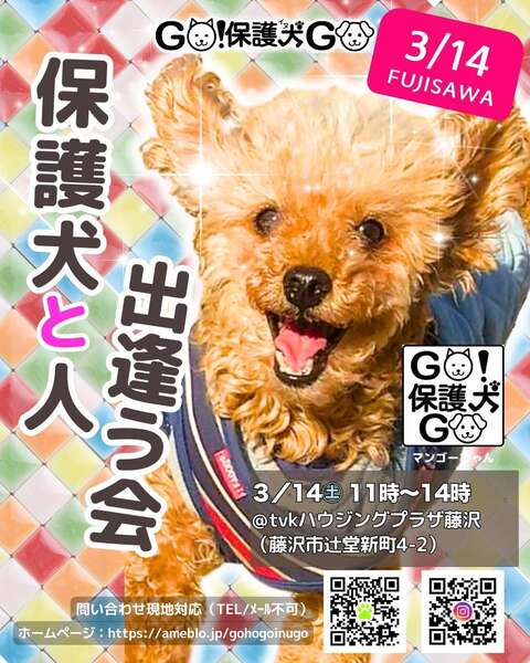 | イベント内容 | ?イベントの予定 迎えなくていい譲渡会です。 GO!保護犬GOでは 譲渡会と呼んでいません 保護犬と人 出会いの会? 犬を見て 迎えた人の話を聞いて 「なにか違う」と思ったら そのままお帰りいただいて大丈夫? 無理に迎える必要はありません それでも また来たいと思ってもらえたら それで十分です スタッフへの差入れ?大歓迎? 本気でお迎えしたい方が最優先ですので、その際はご理解いただき見守ってくださいね? 【ココ ↓↓ で待ってます❤️】 3月14日㈯ 11~14時? トコトコ湘南マルシェ 場所:tvkハウジングプラザ藤沢 (藤沢市辻堂新町4-2) @tokotokoshonan @fujisawa_tvk_housing 棄てるのも人。 拾うのも、また人。 GO!保護犬GOが引き取るのは、 「選ばれなかった犬」たち。 問題犬、シニア、病気やハンデ、 譲渡不適合と判断された犬、 廃業ブリーダーに残された犬たちです。 だからこそ私たちは、 環境・医療・しつけに一切妥協しません。 人と暮らす準備を、最初からやり直します。 「保護犬だから大変」は、もう古い。 その答えを、ぜひ会場で確かめてください。 主な引き取り場所(2024年~2025年9月) ・静岡県富士保健所 ・静岡県中部保健所 ・静岡県東部保健所 ・静岡県賀茂保健所 ・静岡県動物管理指導センター ・静岡市動物愛護センター ・ブリーダー廃業/規模縮小(愛護団体経由) ・愛知県の野犬(愛護団体経由) ・個人飼育放棄(愛護団体経由) **ブリーダー・繁殖業者・販売業者との直接の繋がりは一切ありません **個人宅からの直接引き取りは行いません |