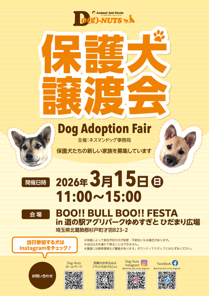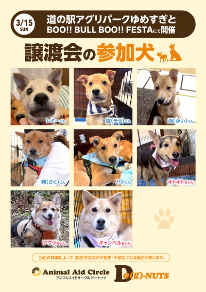 | イベント内容 | 道の駅アグリパークゆめすぎとで開催されるイベント「BOO!!BULL BOO!! FESTA」で譲渡会を開催させていただきます。 動物愛護指導センターに収容されていた中型雑種犬がメイン参加となります。 チャリティ販売も同時に行いますので、ぜひ足をお運びください。 |