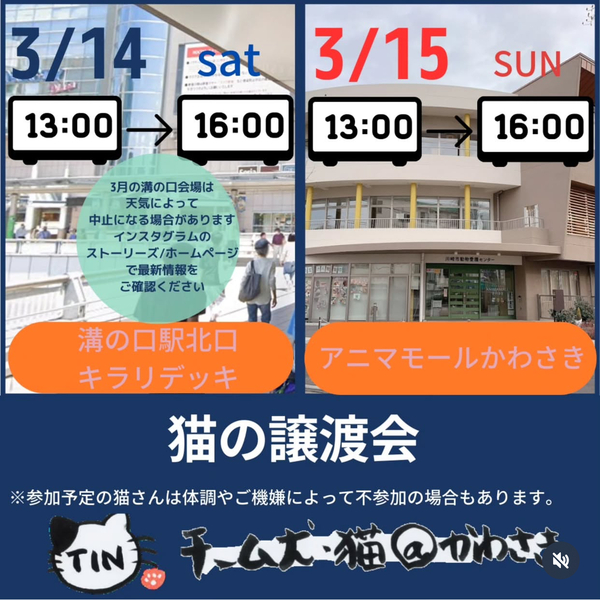 | イベント内容 | ●3月15日(日)アニマモール譲渡会 13時−16時 開催!無料駐車場あり 快適な室内でゆっくり保護猫さんに会えますので是非お立ち寄りください! ★譲渡会参加猫さんは➡️『チーム犬・猫@かわさき』ホームページ/インスタグラムURL★ ご確認ください。 https://teaminuneko-kawasaki.org/ https://www.instagram.com/team.inuneko.kawasaki/?utm_source=ig_embed&ig_rid=bbc4c879-2a7f-4051-bf97-945b15c5299f |