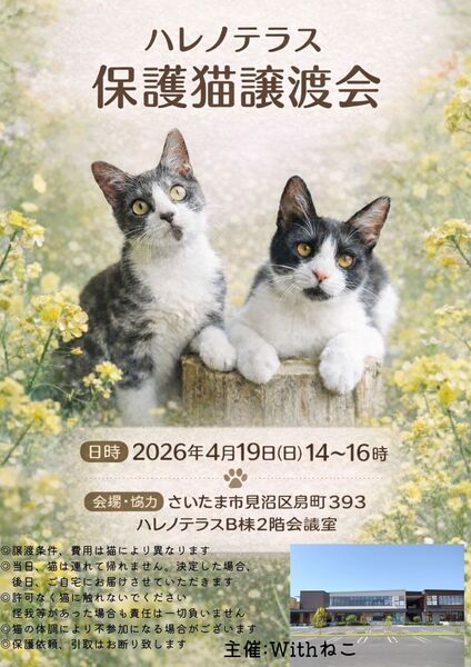 | イベント内容 | 「ずっとのおうち」を探しているコたちがいます ぜひ いいご縁を結びにいらしてください ☆参加予定猫についてはこちらをご覧ください→ https://www.youtube.com/@withneko2222 ※当日、猫の体調・里親決定の場合は不参加になる場合がございます さいたま市近郊で活動している個人ボランティアさんが参加する 冷暖房完備の会議室をお借りして区切られたお部屋で ゆっくり猫と触れ合える環境でのアットホームな譲渡会です 大切に育ててきた子猫から大人猫までが参加します 入場は無料です ☆2019年3月より開催しております こちらの会場で しあわせにゃんこになった数は 400匹以上です ☆一匹一匹清潔な環境で丁寧に健康管理に気を付けて育てています※必要医療は全てかけています ☆里親様のご年齢により 高齢の猫の譲渡も行っています ☆初めて猫を飼う方でも不安がないよう アドバイスさせていただきます 【ご支援のお願い】 おうちで購入したけど食べなかったキャットフード・ペットシート・猫砂等ございましたら お持ちいただければ助かる命があります。ご協力お願いいたします 協力・会場 http://hare-terra.com ハレノテラスB棟 2階会議室【無料駐車場320台】 所在地 埼玉県さいたま市見沼区島町393番地 |