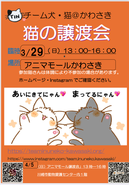 | イベント内容 | ★川崎市動物愛護センター(アニマモールかわかき)1階 南武線平間駅下車徒歩10分位 お車でお越しの方はセンター敷地内無料駐車場がご利用できます。 快適な室内でゆっくり保護猫さんに会えますので是非お立ち寄りください! ●第1日曜日・第3日曜日は定例【アニマモール譲渡会】開催します!! 4月5日(日)アニマモール譲渡会 13時−16時 開催!無料駐車場あり 4月19日(日)アニマモール譲渡会 13時−16時 開催!無料駐車場あり ●第2日日曜日・第4日曜日は定例【溝の口譲渡会】開催します! 4月12日(日)溝の口譲渡会 13時−16時 4月26日(日)溝の口譲渡会 13時−16時 ★譲渡会参加猫さんは➡️『チーム犬・猫@かわさき』ホームページ/インスタグラムURL★ ご確認ください。 https://teaminuneko-kawasaki.org/ https://www.instagram.com/team.inuneko.kawasaki/?utm_source=ig_embed&ig_rid=bbc4c879-2a7f-4051-bf97-945b15c5299f |