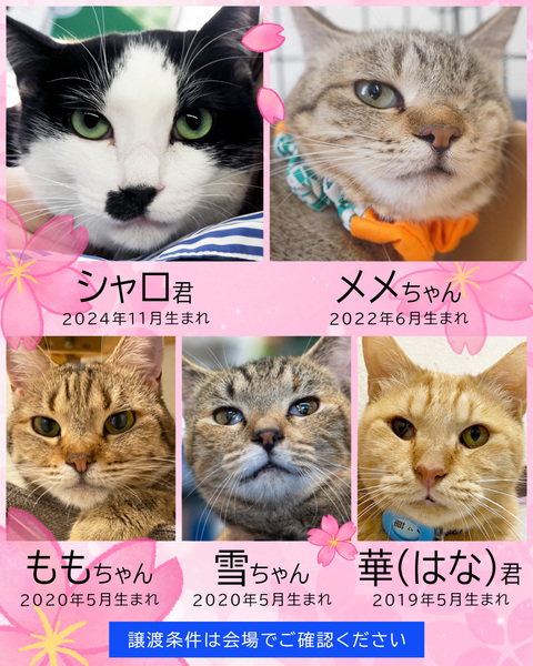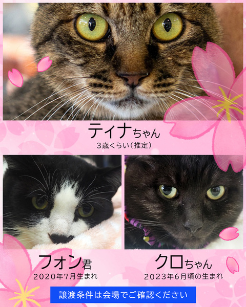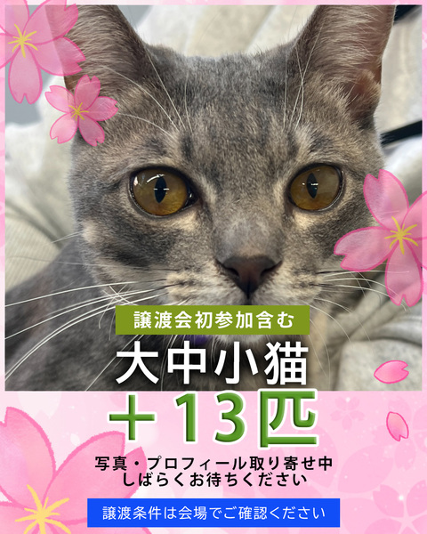 | イベント内容 | 人懐っこい中猫成猫20匹がエントリー♪ 人馴れ抜群、穏やか、抱っこ大好き猫で会場がいっぱいになります(=^・^=) 「おとなねこ」いいですよ!「おとなねこ」を家族に!「おとなねこ」は飼いやすい! 【飼いやすいおとなねこ20匹★みよし市】 ■4月5日(日)10時~15時 ■みよし市カリヨンハウス(みよし市三好丘2-2-1) ※無料P48台、近隣に大型コインPあり <参加団体> NPO法人三好ネコの会 https://www.instagram.com/miyoshineko あいち東郷ねこの会 https://www.instagram.com/togoneko2 猫暖心 https://www.instagram.com/nekodangonet <ご来場前に> ・猫は先着や申入れの順番ではございません。 ・適正と条件を十分考慮させて頂き、トライアル先は抽選で決まります。 ・当選されたご家庭のみに当日電話連絡を差し上げます。 ・体調不良等で不参加になる猫もございます。 ●成猫譲渡手数料/オス30,000円・メス35,000円 ※成猫は不妊去勢済、ワクチン済です。 ※個人参加猫、他団体猫は上記手数料ではございません。 ■主催:NPO法人三好ネコの会 インスタ、Facebook、HPなどのSNSはこちら https://miyoshi-neko.jp/sns <子猫預かりボランティア大募集> もうすぐ春の出産シーズン、子猫シーズンがやってきます。 ご自宅で子猫を愛情いっぱい育ててください。未経験OK♪ 詳しくお話しできますので譲渡会場に直接お越しください。 |