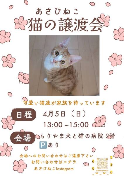 | イベント内容 | 行政機関(保健所・動物愛護センター)から引き取った猫や、地域猫活動中に保護した猫達に家族を探しています (=゚ω゚=) ♡猫を初めて迎えてみたい ♡運命の猫ちゃんと出会いたい ♡先住猫ちゃんの仲間探し たくさんの可愛い猫にぜひ会いに来てください。 皆様のご来場をお待ちしております! 4月5日(日) 13:00〜15:00 ※毎月第1日曜日 会場 もりやま犬と猫の病院 2F 愛知県名古屋市守山区深沢2-101 駐車場あり ※病院へのお問い合わせはご遠慮下さい お問い合わせはコチラ ma47m@yahoo.co.jp ┈┈┈┈┈┈┈┈┈┈ ◎全頭ワクチン接種、ウイルス(FIV、FeLV)検査、マイクロチップ装着済み ◎譲渡には条件がございます 詳しくは下記ブログをご覧ください ↓↓↓ 主催者【あさひねこ】ブログ http://owariasahineko.blog.fc2.com/ インスタグラムアカウント@owariasahineko |