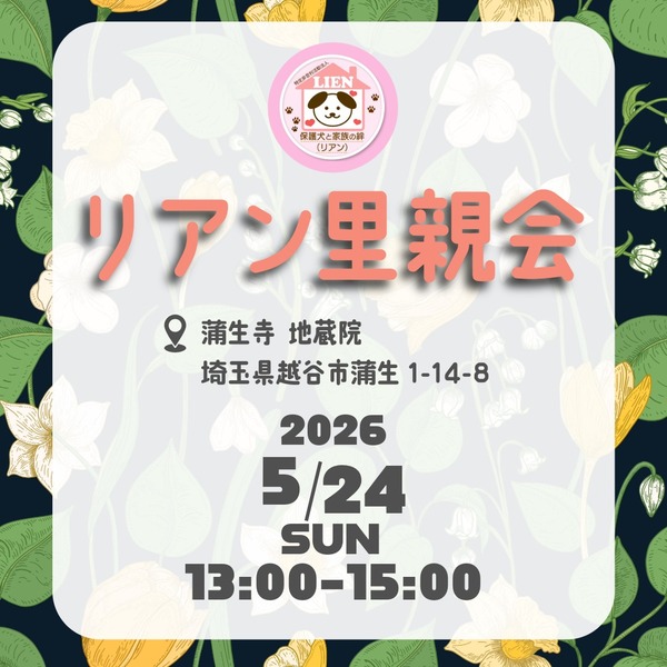 | イベント内容 | 保護犬の譲渡会です。 参加は無料です。 お目当ての子が決まっておりましたら、リアンHPより予めご予約をいただけますとご案内がスムーズです。 「保護犬ってどんな子達なのかな」 「お迎え予定は決まってないけど話を聞いてみたい」 「とりあえず見てみたい!」 どんなきっかけでも構いません。 是非覗きにいらしてください。 ご来場をお待ちしています |