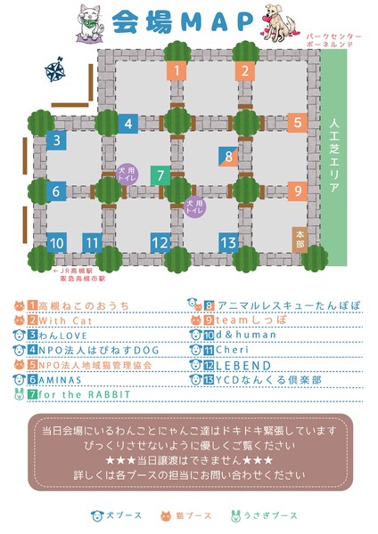 | イベント内容 | 安満遺跡公園「保護いぬ&ねこの譲渡会」に参加 日時 3月28日(土) 11時から15時 場所 大阪府高槻市八丁畷町12-3安満遺跡公園 安満遺跡公園サンスター広場 たくさんの団体が参加します。YCDなんくる倶楽部は犬の譲渡会とバザーをします。13番ブースです 予防接種済の愛犬も連れて入れます。犬連れでない方も利用される公園なので、オシッコの始末など周囲に十分ご配慮ください。 参加犬(予定) ●ディータくん(4か月 琉球犬MIX 黒虎 ♂) ●写真参加 サンちゃん(3歳くらい 琉球犬MIX ♀)他 その他写真参加犬もいます YCDなんくる倶楽部のインスタで犬の紹介をしています @ycdnankuru https://www.instagram.com/ycdnankuru/ |