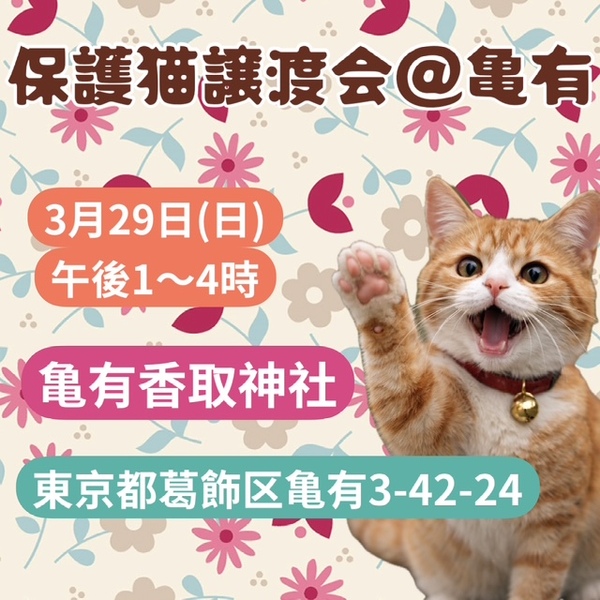| イベント内容 | 様々な理由で保護された猫達、それぞれがあたたかな手を必要としています。 その猫の個性を良く理解し確実なご縁を繋ぐ為、多くの猫達を保護する事は出来ませんが大切な出会いを探しています。お迎えする方の環境や生活スタイルに適した猫さんをご紹介できますので、どういう猫がいいのかと迷っている方へのご相談も受けています。どうそお気軽にいらしてみて下さい。 保護猫譲渡会@亀有 3月29日(日) 東京葛飾区亀有3-42-24 亀有香取神社境内 午後1時~4時 JR亀有駅南口より徒歩5分 ※譲渡会へお越し下さる方は近隣コインパーキングへ駐車頂きますようお願い申し上げます。 【猫の里親をさがす会】 https://x.com/shosukereiko 家族の一員として生涯たっぷり愛情を注いでくださるご家庭をお待ちしています。できましたらご家族形態の方は皆さまでいらして下さい。 【以下の方には譲渡しておりません】 ・猫の飼育が許可されていない住居にお住まいの方 ・未成年者、友人同士&同棲でお住まいの方 ・乳児のいるご家庭、妊娠中の方 ・お引越し予定の方 ・60歳以上の方への子猫譲渡✖ 成猫については猫年齢に見合った年の方に譲渡検討しています。 ・脱走防止対策にご協力頂けない方 ・経済的に不安定な方(休職中、就職活動中、アルバイト、生活保護等) ・猫だけで留守番をする時間が長いなどご希望に沿えない場合があります。 ・住居の構造をお聞きする事があります。(階下への騒音など) ・犬猫を4頭以上飼育している方 他、飼育に適切でないと判断した場合(個体により条件が若干違います) 【当里親会は猫さんと里親様とのマッチングを大切にしています】 はじめて猫さんをお迎えする場合に適した猫さん、お留守番の長い里親さんに適した猫など、ご状況に合わせてアドバイスしています。 【ご負担頂く費用について】 譲渡の際に活動協力金を里親様にご負担頂く事により飼い主のいない猫の継続的治療や保護、新しいご家族の元へ送り出す事ができます。 ご理解とご協力をお願い致します。 ◆活動協力金(譲渡費用)のご負担がございます。 ★成猫(マイクロチップ挿入済)1頭35.000 譲渡会に参加している成猫は不妊去勢が済んでいます。 健康チェック、ワクチン、ウイルスチェック、駆虫、検便、済。 ★子猫1頭20.000 健康チェック、ワクチン、ウイルスチェック、駆虫、検便、済 (マイクロチップ未挿入) |