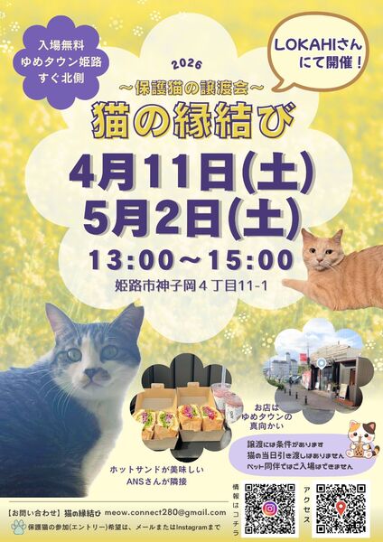 | イベント内容 | 来たる2026年4月11日土曜日・5月2日土曜日 保護猫譲渡会 「猫の縁結び」 を行います?✨ 入場無料、予約不要です。 大人猫から1歳未満の猫まで さまざまな環境から保護された猫さんが参加いたします。 会場は狭いので、来場者数によっては少し お待たせしてしまうかもしれません。 初開催の場所なので、 色々とご不便おかけするかもしれない旨、ご了承ください。 |