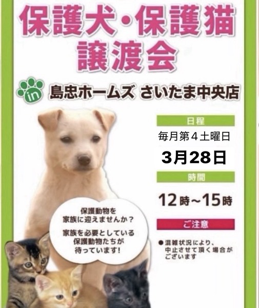 | イベント内容 | *保護犬・保護猫譲渡会* 日時:3/28(土)12時~15時 場所:ホームズさいたま中央店さま いつもお世話になっている 島忠ホームズさまでの譲渡会✨ さいたま中央店様にて《保護犬》の譲渡会も開催します?!! 猫だけでなく、家族を探している保護犬も沢山います。 わんちゃんのお迎えを検討されている方は ぜひ足を運んでみてください✨ お待ちしております!! *…..*…..*…..*…..*…..*…..*…..*…..*…..*….*…..*…..*…..* しっぽたちの物語 Instagram https://www.instagram.com/sippotatinomonogatari?igsh=MXVkbzh3d3lnNzloOA== *…..*…..*…..*…..*…..*…..*…..*…..*…..*….*…..*…..*…..* |