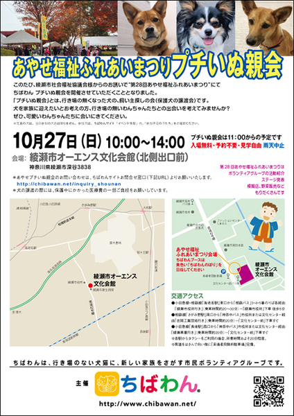 | イベント内容 | 綾瀬市社会福祉協議会主催「あやせ福祉ふれあい祭り」の一角をおかりして 「第5回ちばわん啓蒙活動&プチいぬ親会」を開催いたします。 会場の綾瀬市オーエンス文化会館の中と、その周辺と、駐車場では、色んなイベント盛りだくさんの楽しいお祭りです。心温まるお祭りの一角で「保護犬」のことを多くの方に知っていただけますよう、是非ご来場いただきますようお願いいたします。 ※参加犬が都合つかない場合は、啓蒙活動だけとなりますことをご了承願います。 |