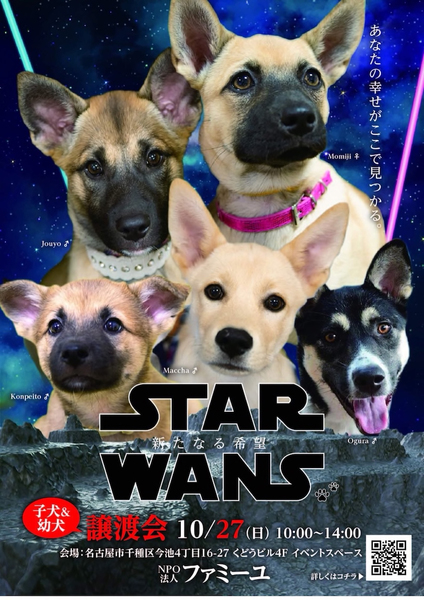 | イベント内容 | NPO法人ファミーユ STAR ☆WANS 希望の星☆のワンコ達に是非会いに来てくださ〜い? ・会場は地下鉄今池駅4番出口から徒歩3分だワン ・車の方は近隣にコインパーキングがたくさんあるワン ・お値打ちなバザー用品も販売してるワン *正式譲渡の前にトライアル期間を設けておりますので、「先住ペットとの相性が心配」という方は、 トライアル期間中にじっくりご検討くださいね *わんこの体調によっては、当日参加できない場合があります *お見合いを希望される方は、ご予約いただけますと確実です <お問い合わせ先> info@npo-famille.org |