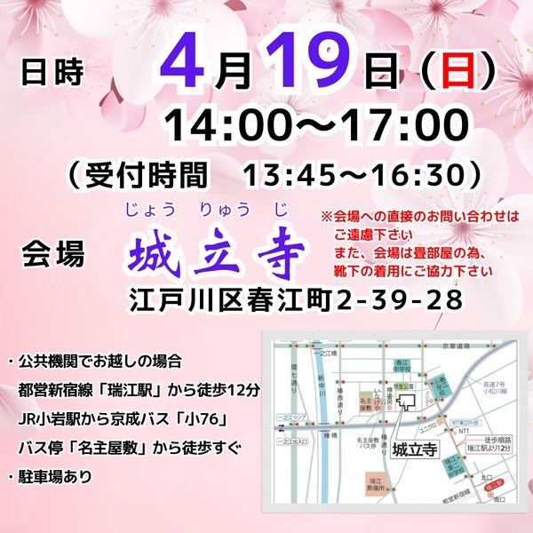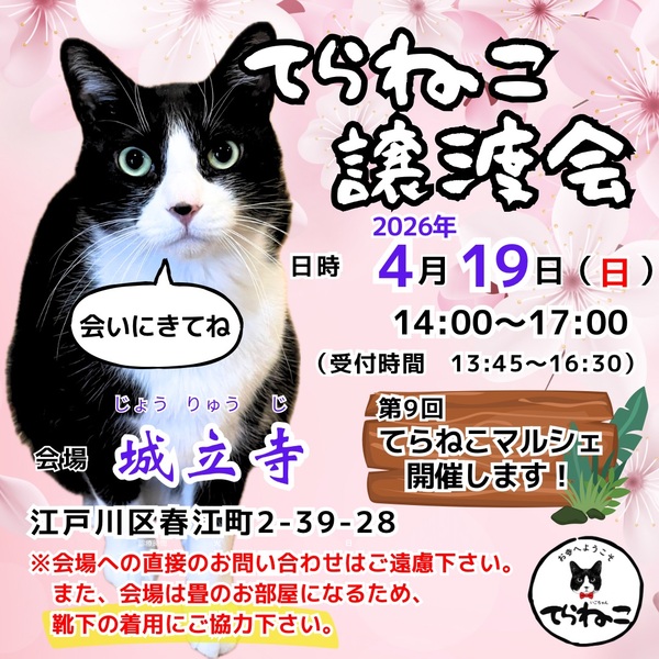| イベント内容 | 掲載が追いついておりませんが、子猫から成猫まで、たくさんの猫ちゃんが参加します。 9回目となる「てらねこマルシェ」も同時開催! 猫雑貨、アニマルコミュニケーションなど、猫好き以外も楽しめるイベントになる予定。 最新情報はInstagramで発信しています‼️ てらねこ譲渡会は、江戸川区支援ボランティアが運営を担い、区外の保護主にも門戸を開き、季節のお花に囲まれた美しいお寺、城立寺様のご協力の下、開催しています。 単身者、高齢者の方など、なかなかお迎えが叶わない方もご相談ください。 子猫から成猫までたくさんの可愛い猫ちゃんが参加します(体調不良の場合、予告なく不参加になる場合があります) 【第23回 てらねこ譲渡会】 日時:2026年4月19日(日) 14:00~17:00 (受付13:45/最終受付16:30) 会場:城立寺(じょうりゅうじ) 住所:江戸川区春江町2-39-28 https://maps.app.goo.gl/rE7j8HNxzK1VV3rAA?g_st=com.google.maps.preview.copy ・公共機関でお越しの場合 都営新宿線「瑞江駅」から徒歩12分 JR小岩駅から京成バス「小76」 バス停「名主屋敷」から徒歩すぐ ※敷地内に駐車スペースがあります(満車の際は近隣にコインパーキングもあります。 |