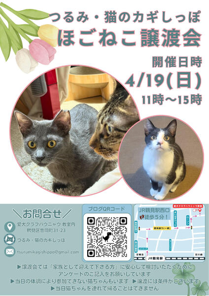 | イベント内容 | 4月19日(日)つるみ・猫のカギしっぽ 定例譲渡会を開催いたします 横浜市鶴見区豊岡町31-23 愛犬クラブバウニャウ 教室内 午前11時~午後3時 お問い合わせ先: tsurumikagishippo@gmail.com 予約は不用です 感染予防のため: ①室内ではマスクを着用していただきます ②入場時にアンケートをご記入いただきます (連絡先等を含む) お問合せは会のメールアドレスにお願いいたします。 tsurumikagishippo@gmail.com 会の譲渡条件をあらかじめ御覧くださいませ (ブログ右上に「ご確認ください」とあります) |