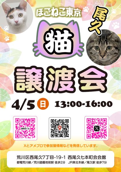 | イベント内容 | とてもアットホームなお見合い会です。 月に一度、尾久や駒込近隣で開催しています。 お見合い時間の制限はなく、ゆっくりじっくりご覧いただけます。どの猫にするか迷われた時は、休憩用の椅子に座ってお考えください。 ======= ●ほごねこ東京@尾久 4/5(日) 13:00〜16:00 会場:西尾久七本町会会館 荒川区西尾久7丁目-19-1 都電荒川線 荒川遊園地前駅 徒歩2分 JR東北本線 尾久駅 徒歩7分 ======= ●予約不要、入場無料です。 ●室内は靴を脱いでいただきます。 ●手指消毒のご協力をお願いいたします。 ●アンケート用紙にご記入ください。 ●お申し込みしたい猫が見つかりましたら、スタッフにお声がけください。生活環境や条件についてヒアリングさせていただきます。 ●お申し込みの有無は保護主が判断します。お話の順番をお待ちいただく事があります。 ●同時に他で募集されている猫へのお申し込みを検討されている場合は、ご縁の確実性を考慮し、お申し込みはお断りしております。 ●トライアル(パネル参加の子はお見合い)決定の有無は後日お電話かSMSにてお知らせいたします。再度ヒアリングさせていただく事がありますのでご了承ください。当日決定はしません。 ●参加予定の猫が欠席、または変更する場合があります。 ====== 猫の終生幸せな暮らしを守るため、以下の譲渡条件を設けております <基本譲渡条件> ・ペット可物件に居住 ・ご家族全員の同意と面談 ・完全室内飼育(ベランダ、庭、帰省先や旅行先への同伴不可) ・空調などによる室温管理 ・責任と愛情をもって終生飼育 ・適切な医療措置(先住猫についても同様) ・質の良いフードの継続 ・不妊手術の実施と報告 ・脱走や危険防止対策 ・清潔な環境とお部屋の整理整頓 ・全てのお部屋の出入りが自由(特別な場合を除く) ・一部の医療費と支援金のご負担 ・身分証明書を提示と契約書の取り交わし ・写真数枚や動画付きの定期報告 ======= ※せっかくご来場いただいてもお申し込みをお受けできないことがございます。以下もお読みいただきますようお願いいたします。 ・一般的にご自身で終生飼育が難しい事が予想される方 (20年以上生きる長生きの子が増えています。最後までしっかりお世話する事ができるか、よくお考えください。子猫・幼猫希望は55歳位までを目安としておりますが、徒歩圏内に後見人がいるなど、条件次第で変わります。) ・子猫・幼猫希望でお留守番時間が長い方(お子様や高齢者のみのお留守番は不可です。) ・脱走防止など、安全対策に全面協力していただけない ・自動製品に頼りすぎなど、毎日の健康管理を怠っている ・安定収入(経済力)がない方 ・未成年、単身の方、妊娠中の方、高齢の方 ・個々が経済的に自立していない同棲カップル ・お部屋が狭い、猫が走り回れるスペースを確保できない(譲渡目安:1LDK〜、約40平米〜。猫により狭いお部屋でも可能な場合があります。) ・先住犬、ハイシニアの先住猫がいる ・喫煙者多数、動物に配慮しない喫煙者がいる ・ご家族お揃いで面談ができない(特別な場合を除く) ・お引っ越し予定がある など 保護主や、猫によって希望条件が異なります。 |