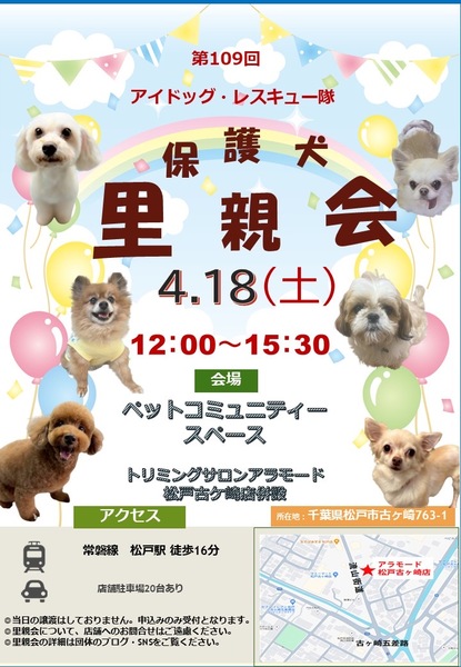 | イベント内容 | 【第109回アイドッグ里親会(松戸)のお知らせ】 以下の通り、里親会を開催します。 ・日時:4月18日(土)12:00~15:30 ・会場:「ペットコミュニティースペース」 トリミングサロンアラモード松戸古ヶ崎店併設 https://www.ts-alamode.com/salon-list/matsudo-kogasaki/ ・住所:千葉県松戸市古ケ崎763-1 ・アクセス 常磐線 松戸駅より徒歩16分 店舗駐車場20台あり 参加犬については後日お知らせいたします。 ⭐️皆様のお越しをお待ちしています⭐️ |