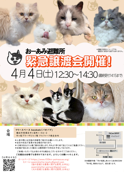 | イベント内容 | ☆★☆★☆★☆★☆★☆★☆★☆★☆★☆★☆★☆★☆★☆★☆★☆★☆★☆★☆ ~4月4日(土)市ヶ尾にて譲渡会開催!~ ◎場所・・「フリースペース baobab(バオバブ)」 神奈川県横浜市青葉区市ヶ尾町1154-2 市ヶ尾プラーザビル1階 アルファード商店会内 田園都市線「市ヶ尾」駅西口より徒歩約30秒 ◎日程・・4月4日(土)(雨天決行) ◎時間・・12時30分から14時30分(受付は14時15分まで) (会場に利用可能な駐車場はございません。近隣のコインパーキングをご利用ください。) *12時30分より入場ご案内を致します。それより早く来て並ぶ事はご遠慮下さい。 *参加の際は、アルコール消毒のご協力をお願いいたします。 *混雑状況により、入場制限をさせていただく場合がございます。 ※参加予定の犬猫は体調により参加できない場合があります。ご了承ください。 ☆★☆★☆★☆★☆★☆★☆★☆★☆★☆★☆★☆★☆★☆★☆★☆★☆★☆★☆ |